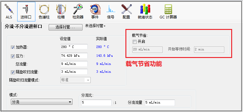 载气节省功能常用于分流流量或者吹扫流量较大的分析中,尤其是载气使用氦气、氢气等的情况下。