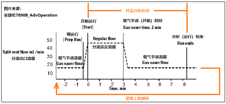 ③分流流量减少至设定值(参数:载气节省流量)后,该设定流量(参数:载气节省流量)在样品分析结束后仍然保持,并将一直持续至在仪器面板上触发预运行键/[Prep Run],随后分流流量回复正常设置值,仪器进入分析前的就绪状态。